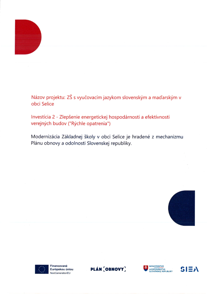 Projekt - Nákup materiálno-technickej vybavenosti materskej školy - Investícia 2 -Zlepšenie energetickej hospodárnosti a efektívnosti verejných budov („Rýchle opatrenia”)